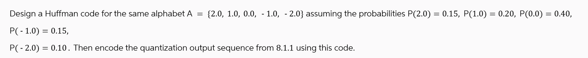 P( - 2.0) - = 0.10. Then encode the quantization output sequence from 8.1.1 using this code.