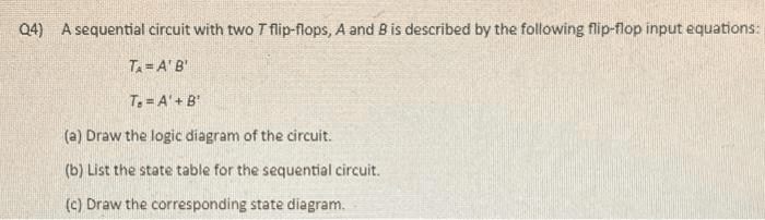 Q4) A sequential circuit with two T flip-flops, A and B is described by the following flip-flop input equations: