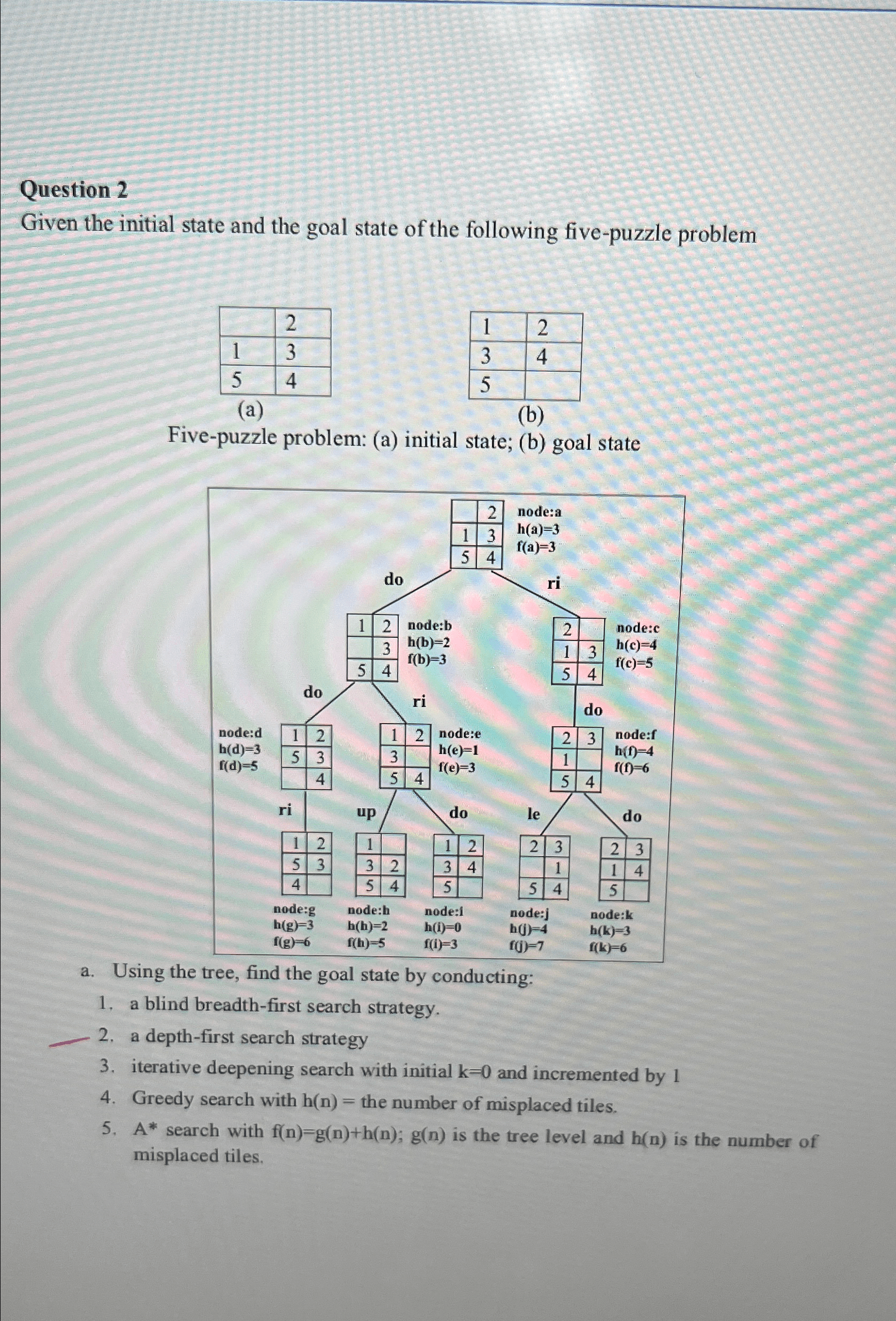 Given the initial state and the goal state of the following five-puzzle problem