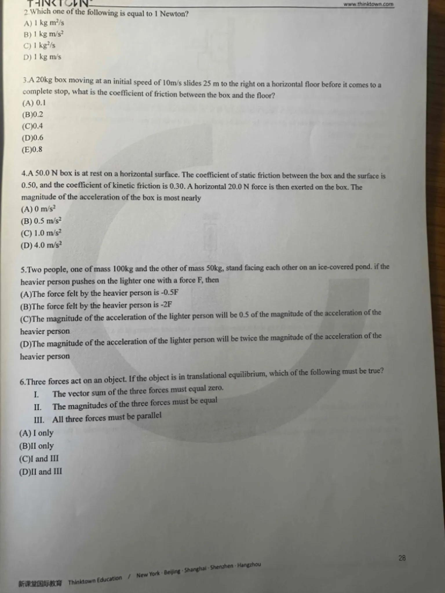 4.A 50.0 N box is at rest on a horizontal surface. The coefficient of static friction between the box and the surface is 0.50 , and the coefficient of kinetic friction is 0.30 . A horizontal 20.0 N force is then exerted on the box. The magnitude of the acceleration of the box is most nearly