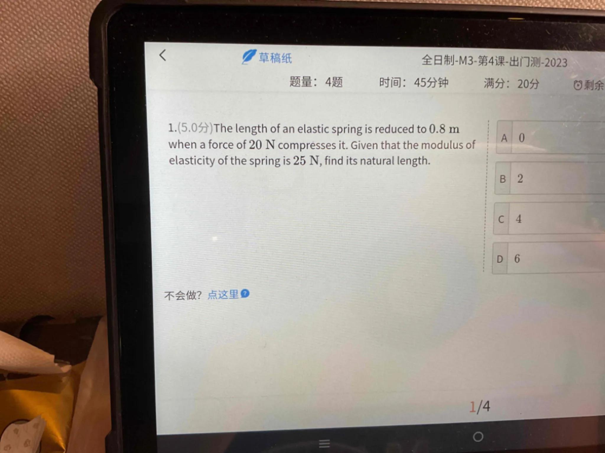 1.(5.0分) The length of an elastic spring is reduced to 0.8 m when a force of 20 N compresses it. Given that the modulus of elasticity of the spring is 25 N , find its natural length.