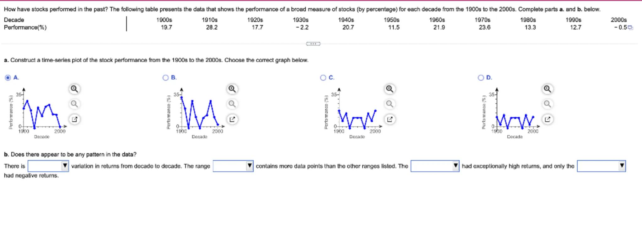 Regarding the student's question, it seems that you are asking for an analysis of a table and corresponding time-series plots related to stock performance over decades. However, without the actual image or data, I cannot provide a specific analysis or answer. If you can provide the data or describe the plots and table in detail, I would be happy to help you interpret the information and answer any questions you may have about patterns or variations in the stock performance data.