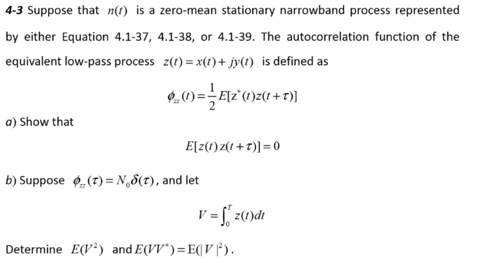 4-3 Suppose that is a zero-mean stationary narrowband process represented by either Equation 4.1-37, 4.1-38, or 4.1-39. The autocorrelation function of the equivalent low-pass process is defined as
