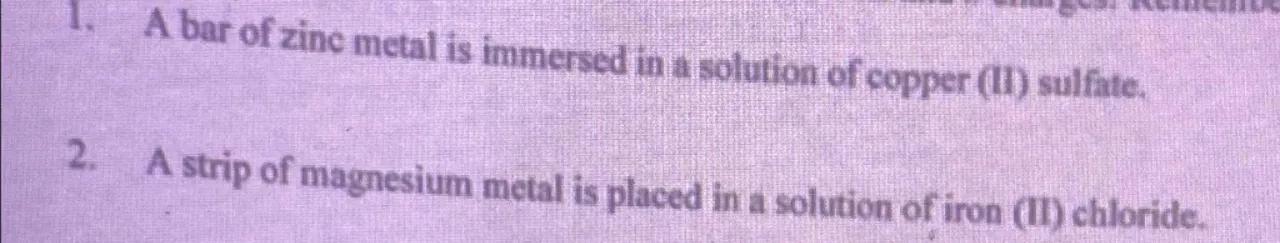 1. A bar of zinc metal is immersed in a solution of copper (II) sulfate.