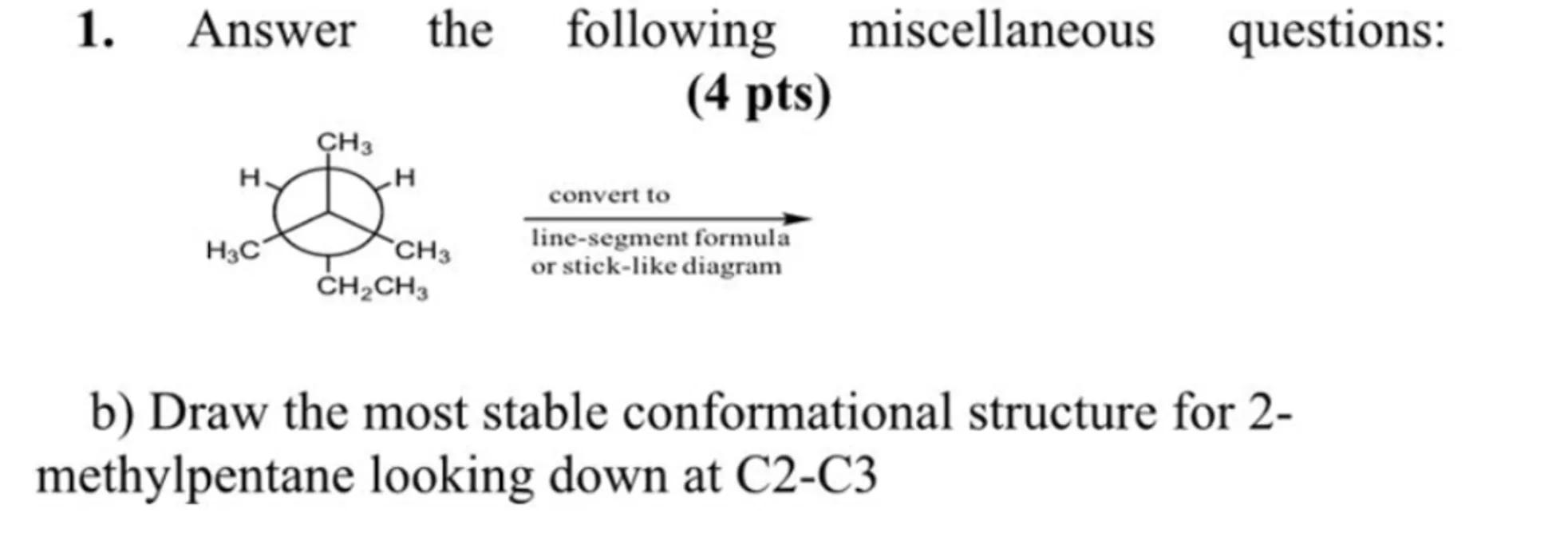 b) Draw the most stable conformational structure for 2methylpentane looking down at