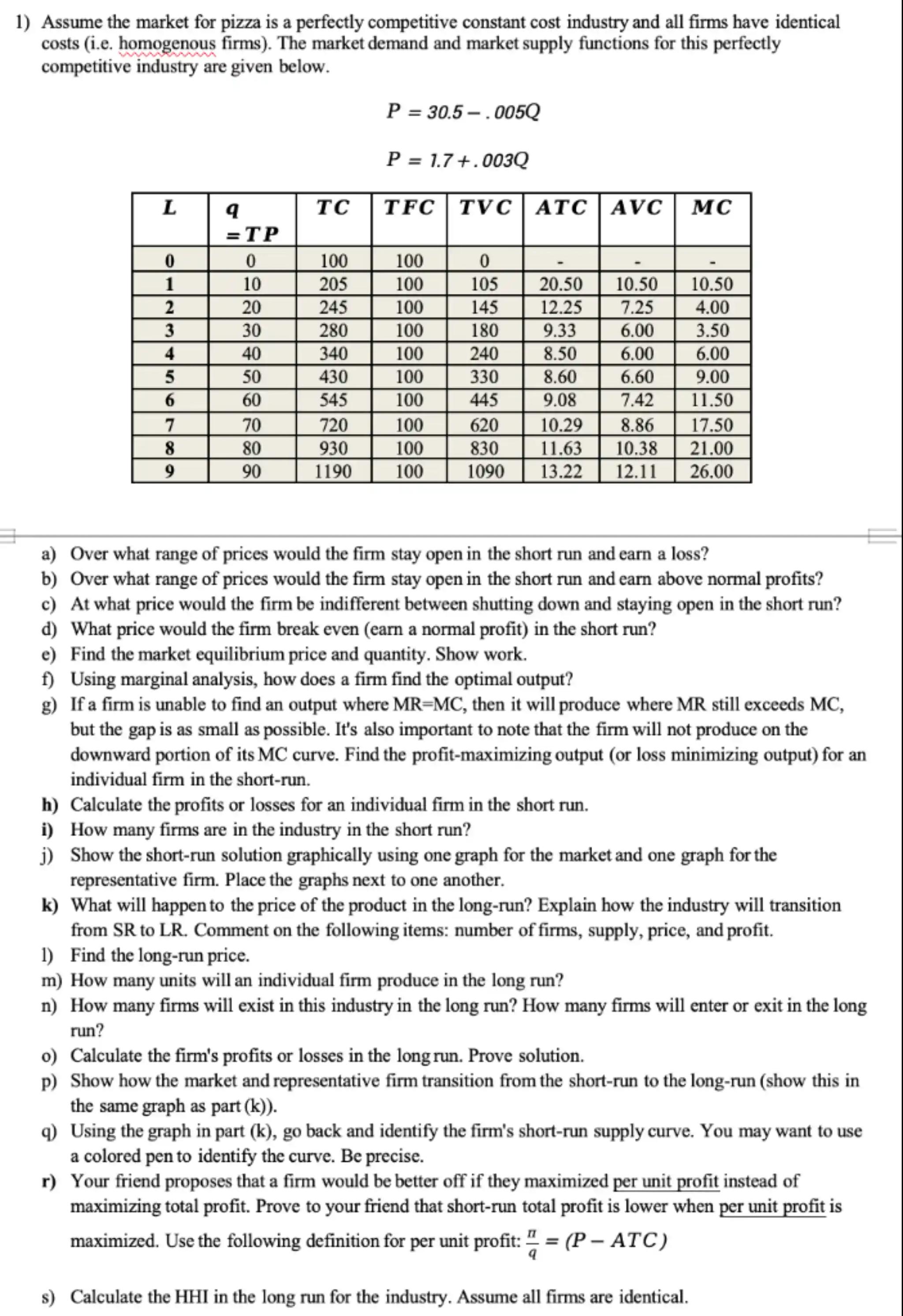1) Assume the market for pizza is a perfectly competitive constant cost industry and all firms have identical costs (i.e. homogenous firms). The market demand and market supply functions for this perfectly competitive industry are given below.