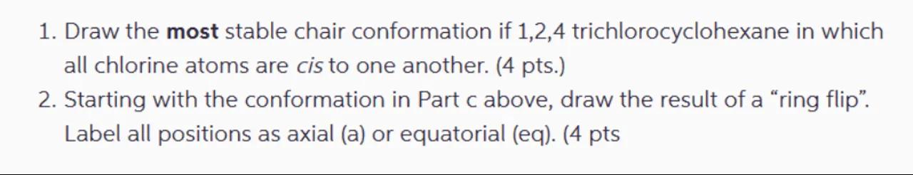 1. Draw the most stable chair conformation if trichlorocyclohexane in which all chlorine atoms are cis to one another. (4 pts.)