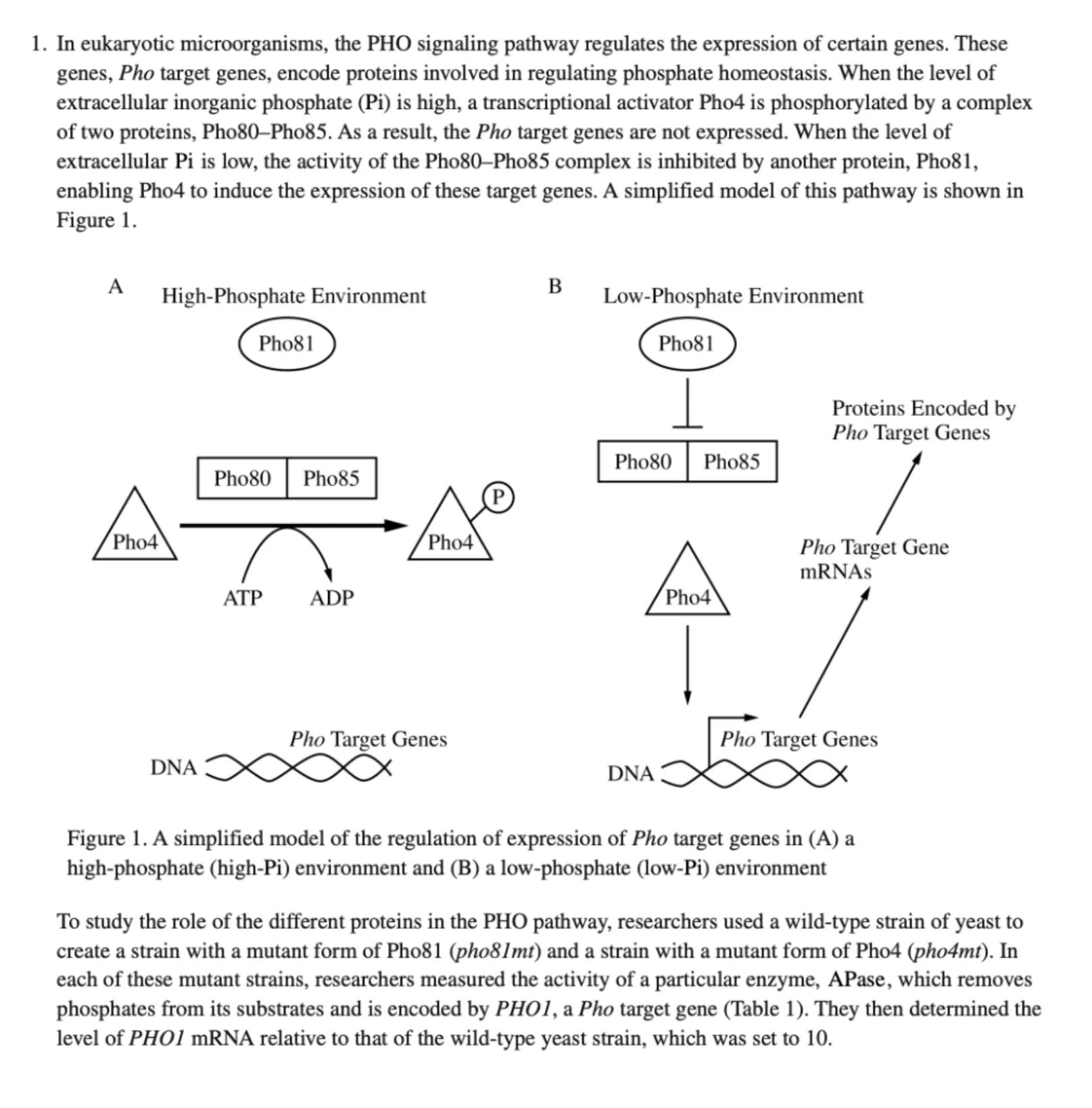 To study the role of the different proteins in the PHO pathway, researchers used a wild-type strain of yeast to create a strain with a mutant form of Pho81 (pho81mt) and a strain with a mutant form of Pho4 (pho4mt). In each of these mutant strains, researchers measured the activity of a particular enzyme, APase, which removes phosphates from its substrates and is encoded by PHO1, a Pho target gene (Table 1). They then determined the level of PHO1 mRNA relative to that of the wild-type yeast strain, which was set to 10.