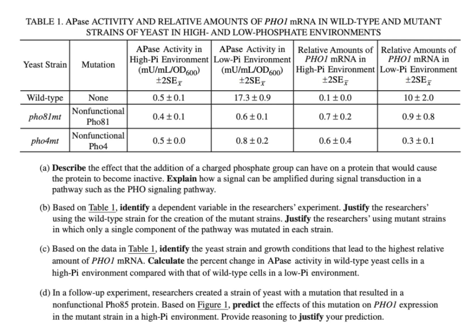 (c) Based on the data in Table 1, identify the yeast strain and growth conditions that lead to the highest relative amount of PHOI mRNA. Calculate the percent change in APase activity in wild-type yeast cells in a high-Pi environment compared with that of wild-type cells in a low-Pi environment.