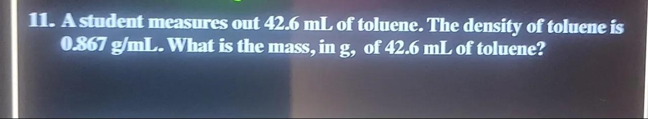 11. A student measures out of toluene. The density of toluene is . What is the mass, in , of of toluene?
