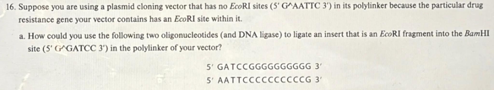 16. Suppose you are using a plasmid cloning vector that has no EcoRI sites ( AATTC ) in its polylinker because the particular drug resistance gene your vector contains has an EcoRI site within it.