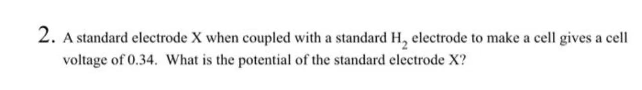 2. A standard electrode when coupled with a standard electrode to make a cell gives a cell voltage of 0.34 . What is the potential of the standard electrode X?