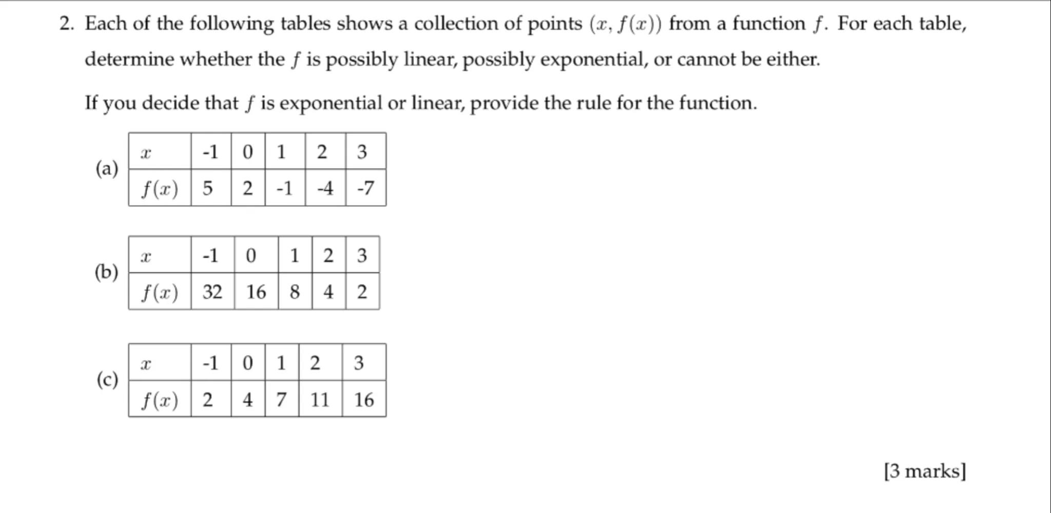 2. Each of the following tables shows a collection of points from a function . For each table, determine whether the is possibly linear, possibly exponential, or cannot be either.
