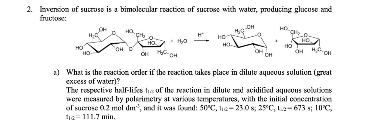 2. Inversion of sucrose is a bimolecular reaction of sucrose with water, producing glucose and fructose: