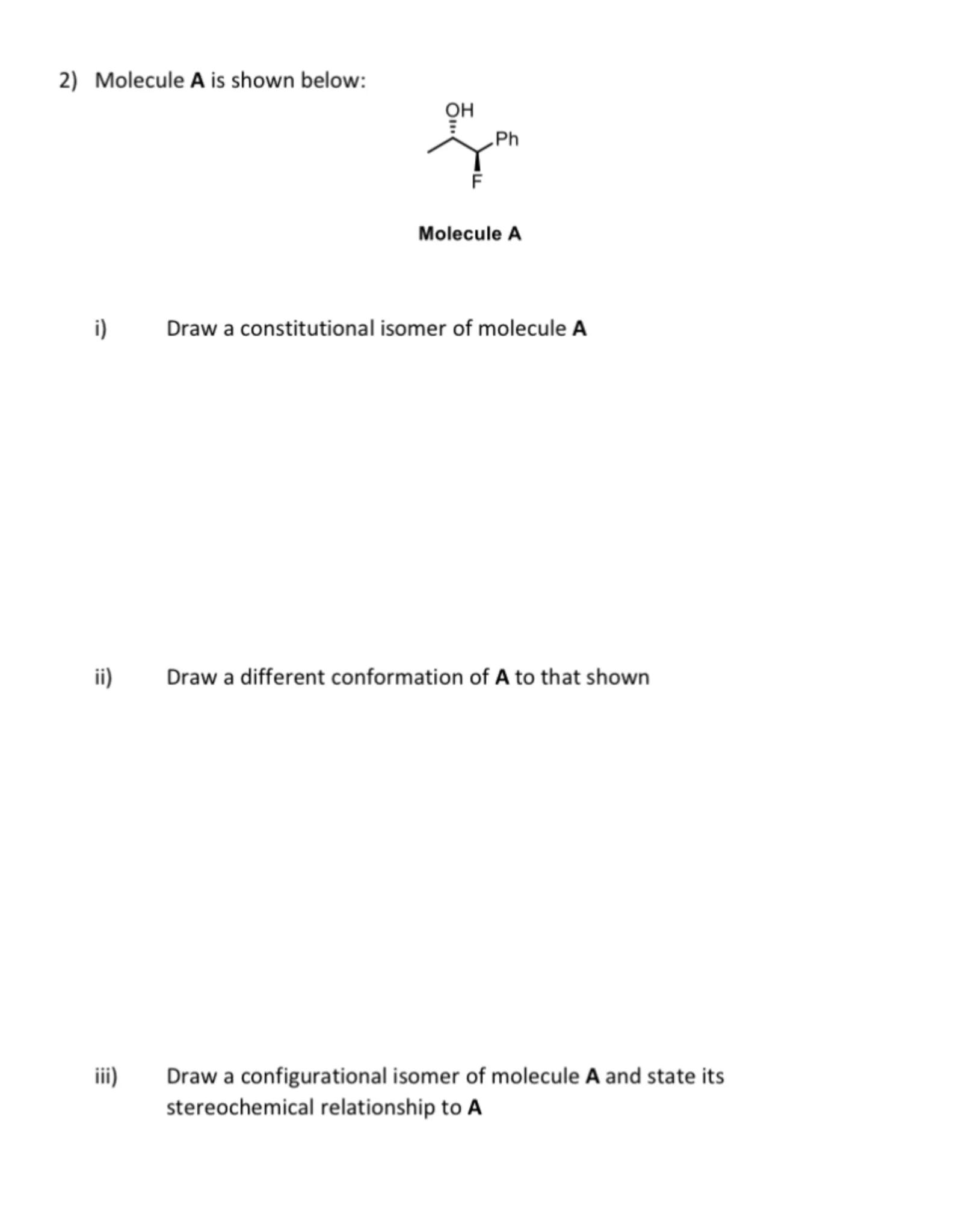 3. Configurational Isomer: A configurational isomer has the same connectivity of atoms but differs in the spatial arrangement of atoms due to the presence of double bonds or rings. To draw a configurational isomer of Molecule A, you would need to identify any stereocenters (chiral centers) in the molecule and draw the isomer that has a different arrangement of the substituents around those centers. You would also need to state the stereochemical relationship, such as whether the isomers are enantiomers (non-superimposable mirror images) or diastereomers (not mirror images).