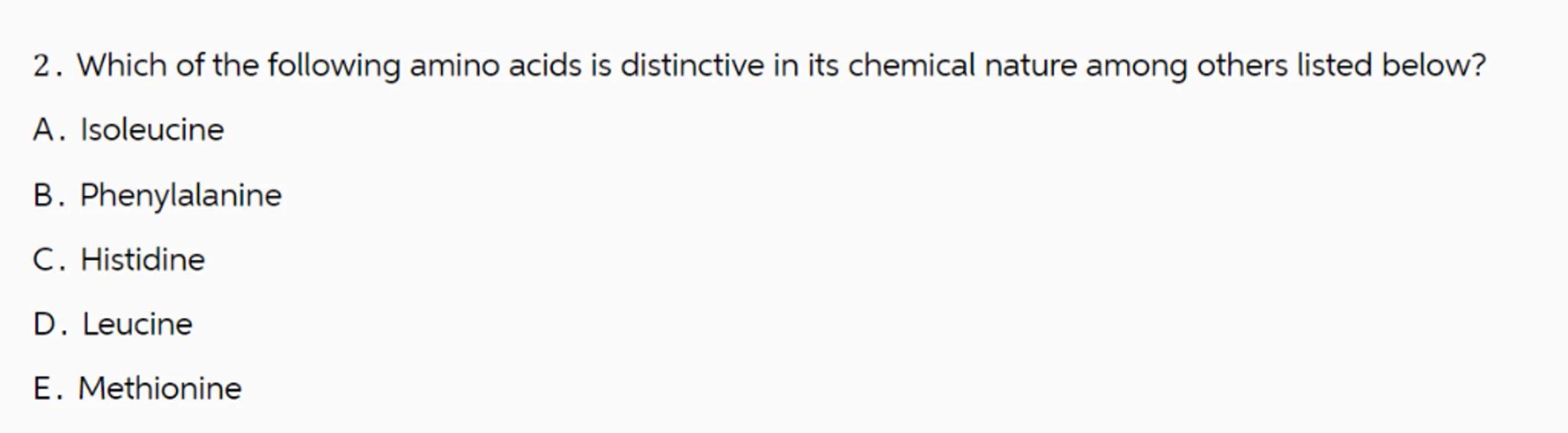 2. Which of the following amino acids is distinctive in its chemical nature among others listed below?