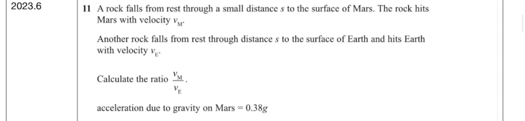 11 A rock falls from rest through a small distance  to the surface of Mars. The rock hits Mars with velocity .