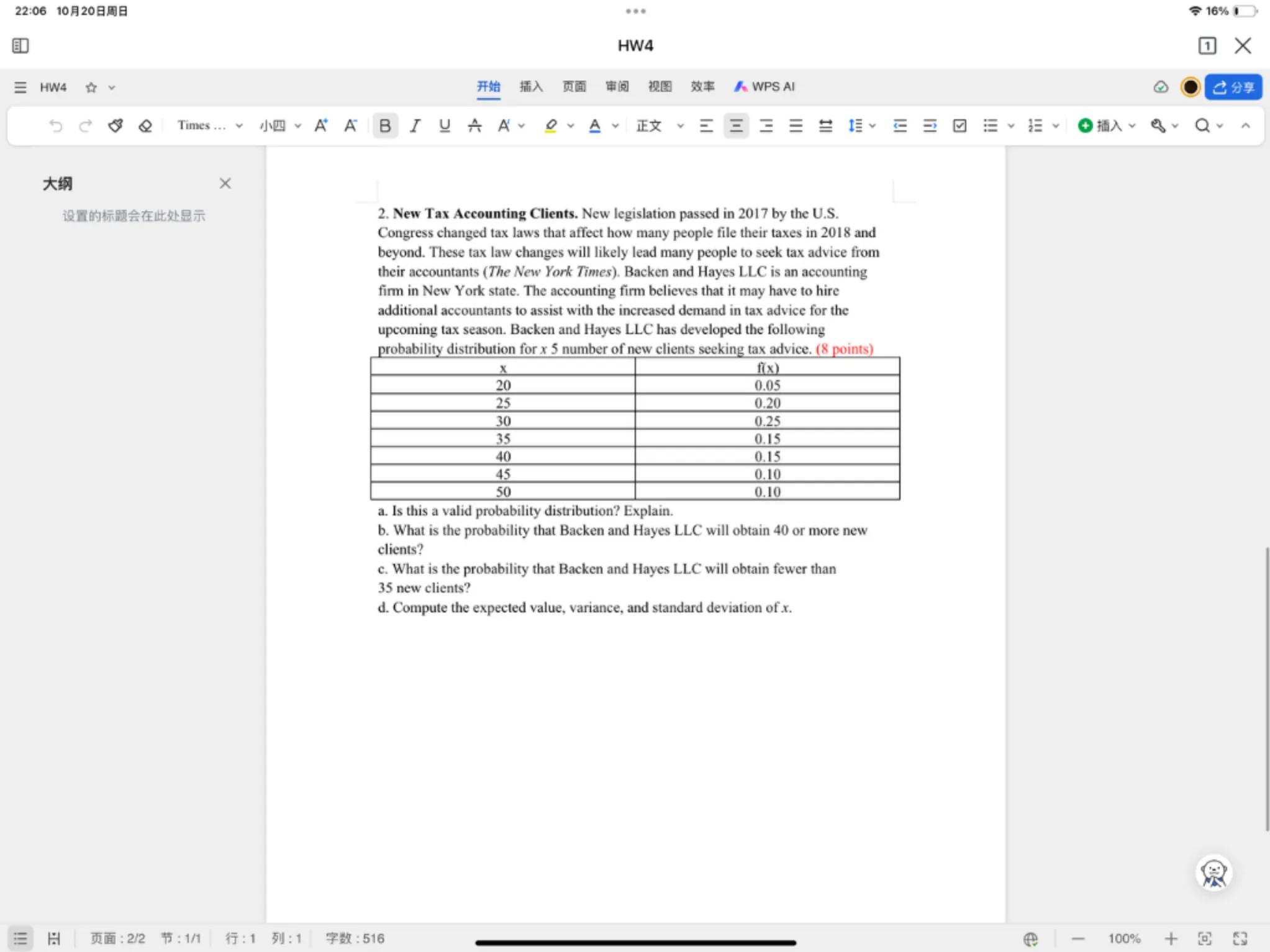 2. New Tax Accounting Clients. New legislation passed in 2017 by the U.S. Congress changed tax laws that affect how many people file their taxes in 2018 and beyond. These tax law changes will likely lead many people to seek tax advice from their accountants (The New York Times). Backen and Hayes LLC is an accounting firm in New York state. The accounting firm believes that it may have to hire additional accountants to assist with the increased demand in tax advice for the upcoming tax season. Backen and Hayes LLC has developed the following probability distribution for number of new clients seeking tax advice. ( 8 points)