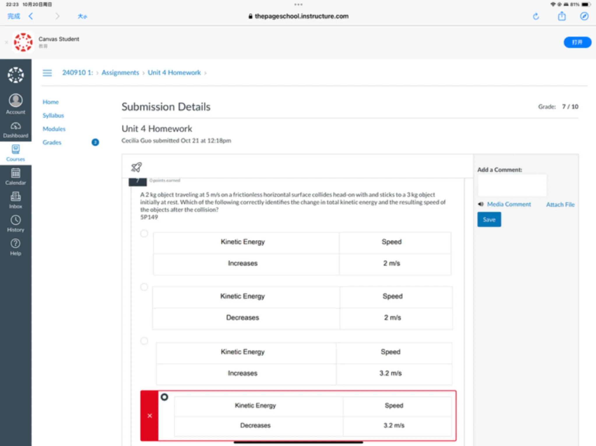 A 2 kg object traveling at on a frictionless horizontal surface col-Ides head-on with and sticks to a 3 kg object initially at rest. Which of the following correctly identifes the change in total kinetic energy and the resulting speed of the objects after the collision? 5 P149