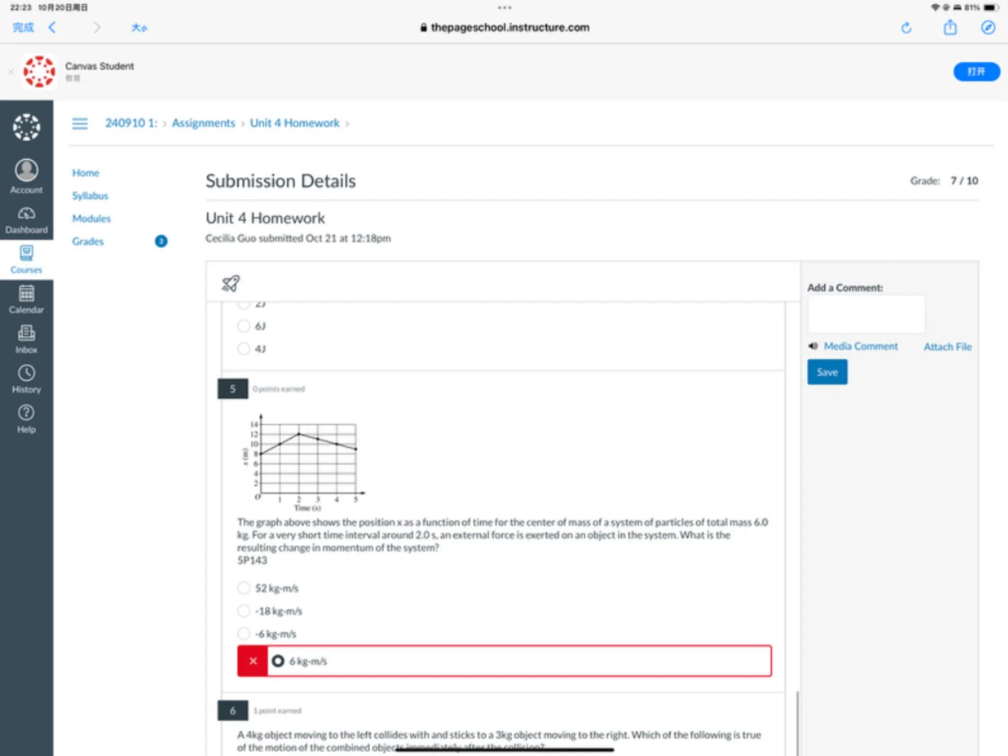 The graph above shows the position x as a function of time for the center of mass of a system of particles of total mass 6.0 kg. For a very short time interval around 2.0 s , an external force is exerted on an object in the system. What is the resulting change in momentum of the system? SP143