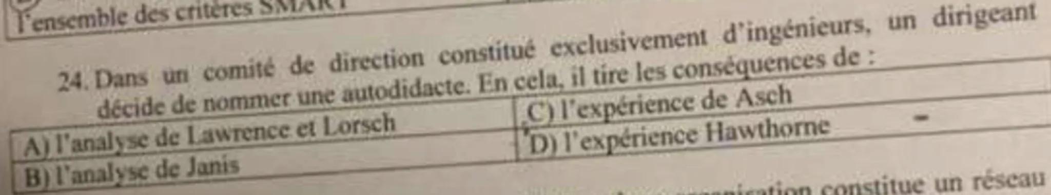\hline A) l'analyse de Lawrence et Lorsch & C) l'expérience de Asch \\