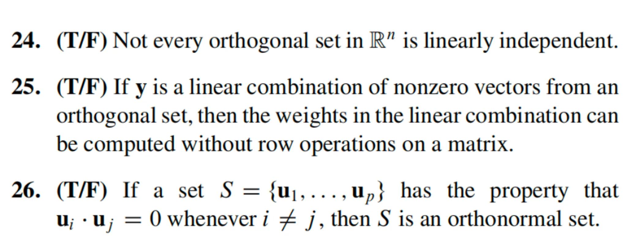 24. (T/F) Not every orthogonal set in is linearly independent.