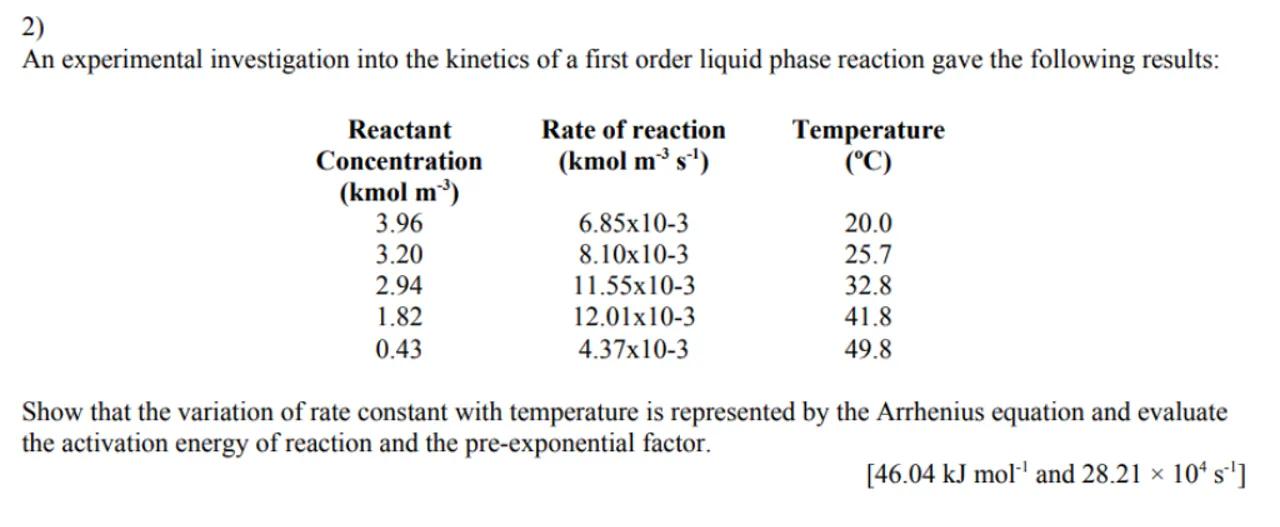 An experimental investigation into the kinetics of a first order liquid phase reaction gave the following results: