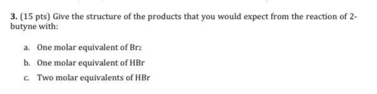 3. (15 pts) Give the structure of the products that you would expect from the reaction of 2 butyne with: