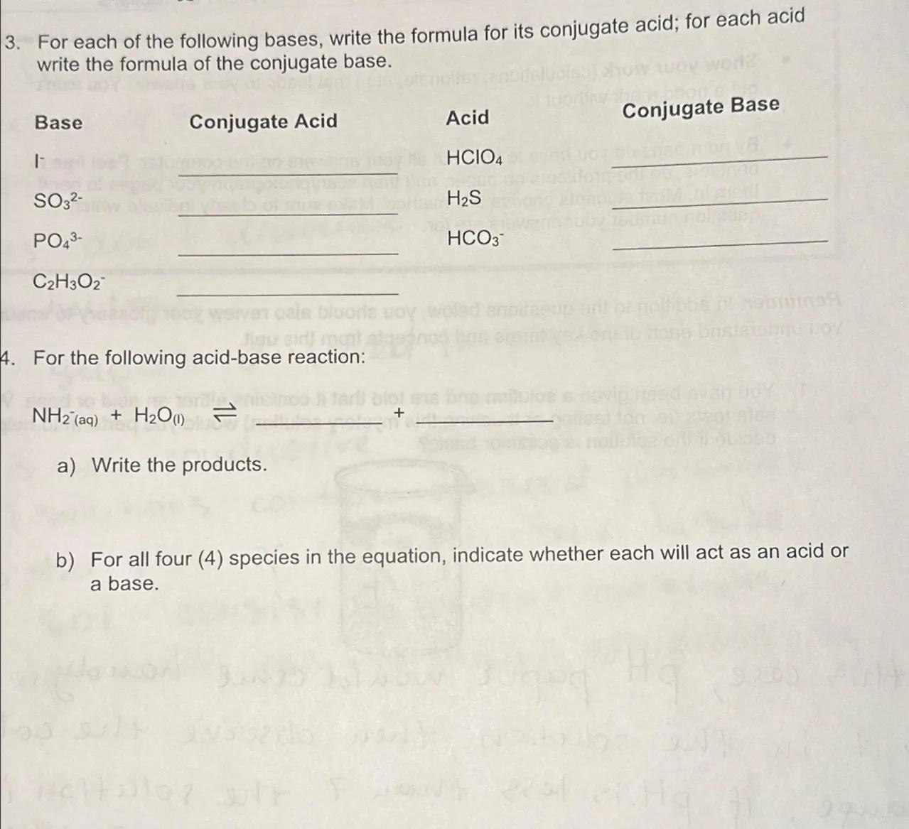 3. For each of the following bases, write the formula for its conjugate acid; for each acid write the formula of the conjugate base.
