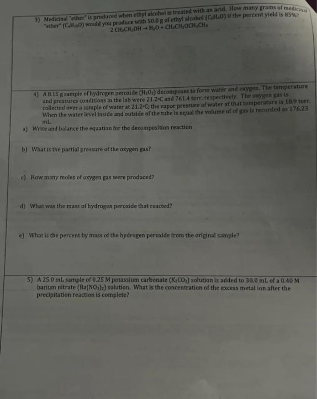 4)  sample of hydrogen peroxide  decomposes to form water and oxygen. The temperature and pressures conditions in the lab were 21.2 eC and 761.4 torr, respectively. The oxygen gas is collected over a sample of water at ; the vapor pressure of water at that temperature is . When the water level inside and outside of the tube is equal the volume of of gas is recurded as 176.23 .