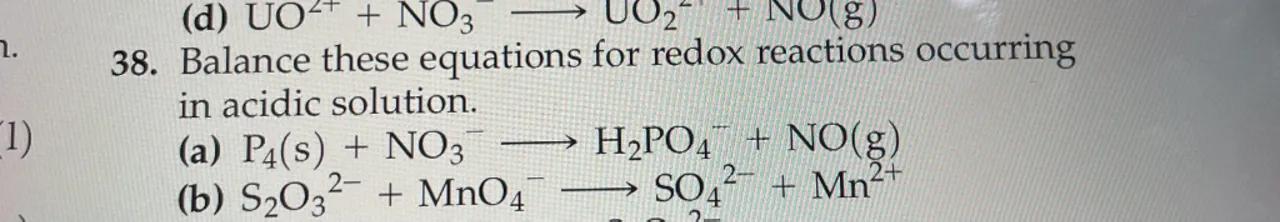 38. Balance these equations for redox reactions occurring in acidic solution.