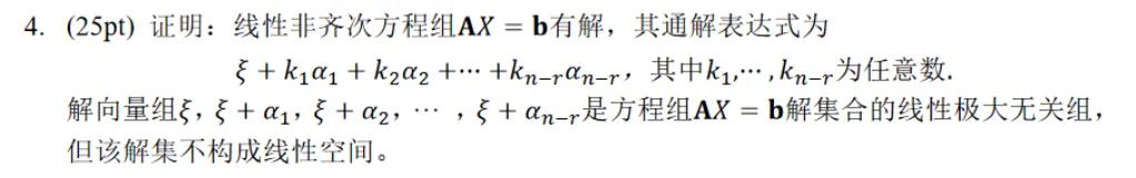 4. (25pt) 证明: 线性非齐次方程组  有解, 其通解表达式为  ,其中  为任意数。