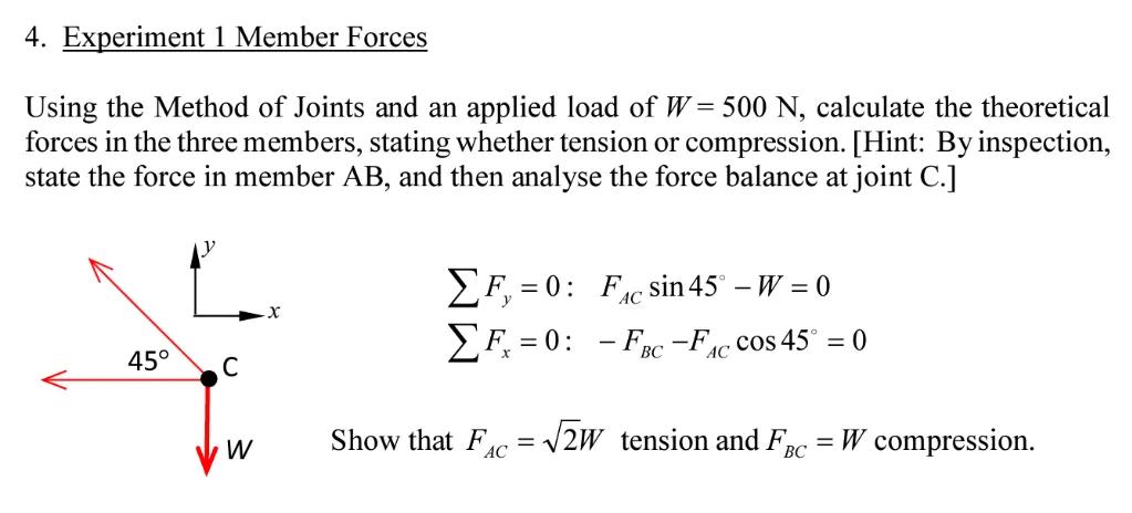 Using the Method of Joints and an applied load of , calculate the theoretical forces in the three members, stating whether tension or compression. [Hint: By inspection, state the force in member AB , and then analyse the force balance at joint C .]