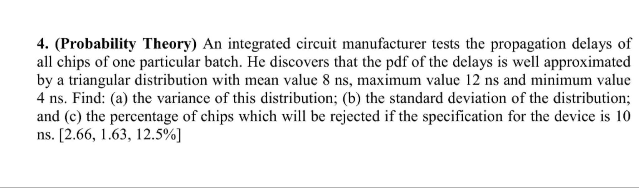 4. (Probability Theory) An integrated circuit manufacturer tests the propagation delays of all chips of one particular batch. He discovers that the pdf of the delays is well approximated by a triangular distribution with mean value 8 ns , maximum value 12 ns and minimum value 4 ns . Find: (a) the variance of this distribution; (b) the standard deviation of the distribution; and (c) the percentage of chips which will be rejected if the specification for the device is 10 ns.