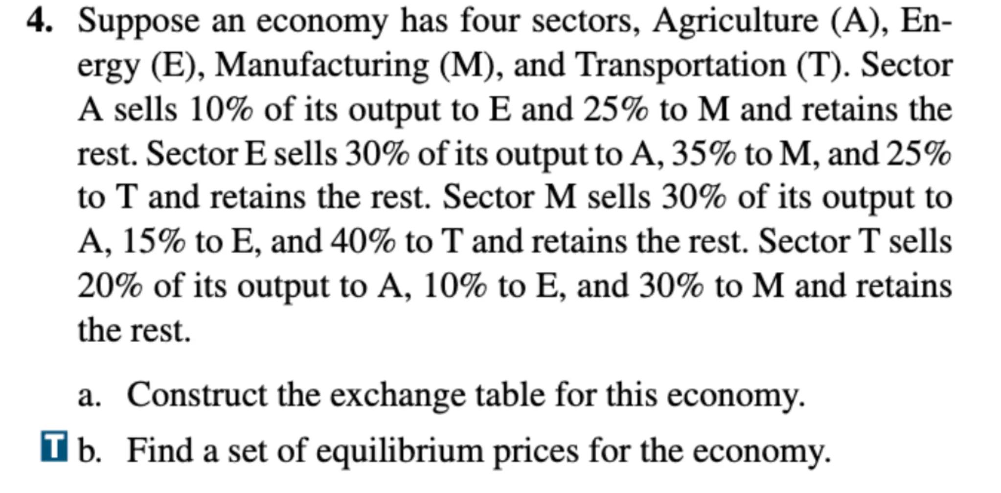 4. Suppose an economy has four sectors, Agriculture (A), Energy (E), Manufacturing (M), and Transportation (T). Sector A sells of its output to E and to M and retains the rest. Sector E sells 30\% of its output to A, 35\% to M, and to T and retains the rest. Sector M sells of its output to A, to E , and to T and retains the rest. Sector T sells of its output to to E , and to M and retains the rest.