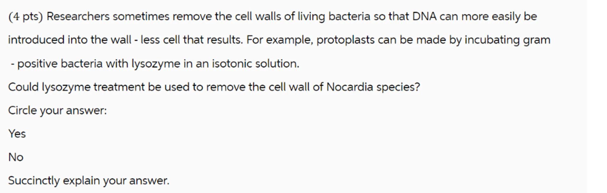 (4 pts) Researchers sometimes remove the cell walls of living bacteria so that DNA can more easily be introduced into the wall - less cell that results. For example, protoplasts can be made by incubating gram
