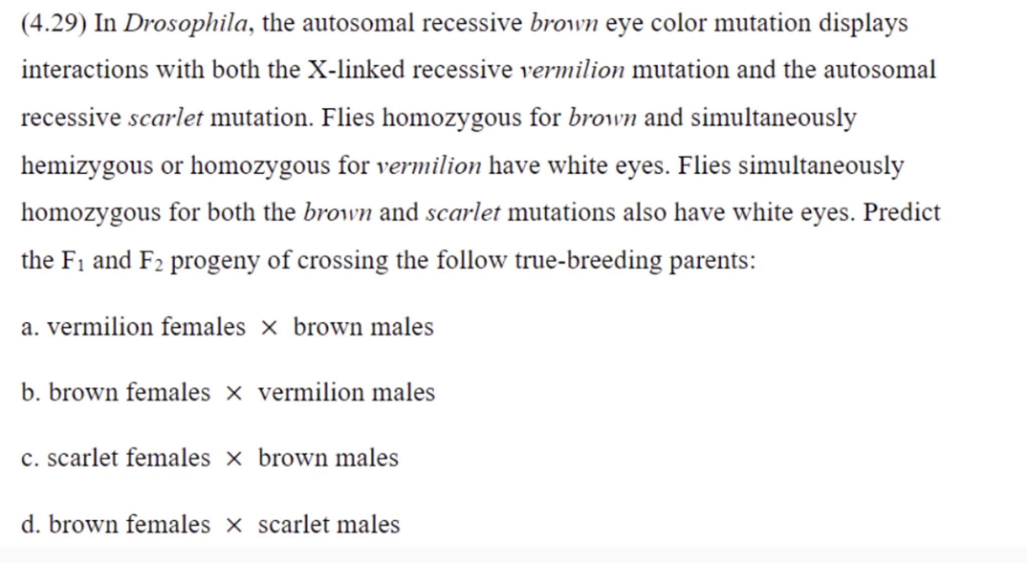 (4.29) In Drosophila, the autosomal recessive brown eye color mutation displays interactions with both the -linked recessive vermilion mutation and the autosomal recessive scarlet mutation. Flies homozygous for brown and simultaneously hemizygous or homozygous for vermilion have white eyes. Flies simultaneously homozygous for both the brown and scarlet mutations also have white eyes. Predict the and progeny of crossing the follow true-breeding parents: