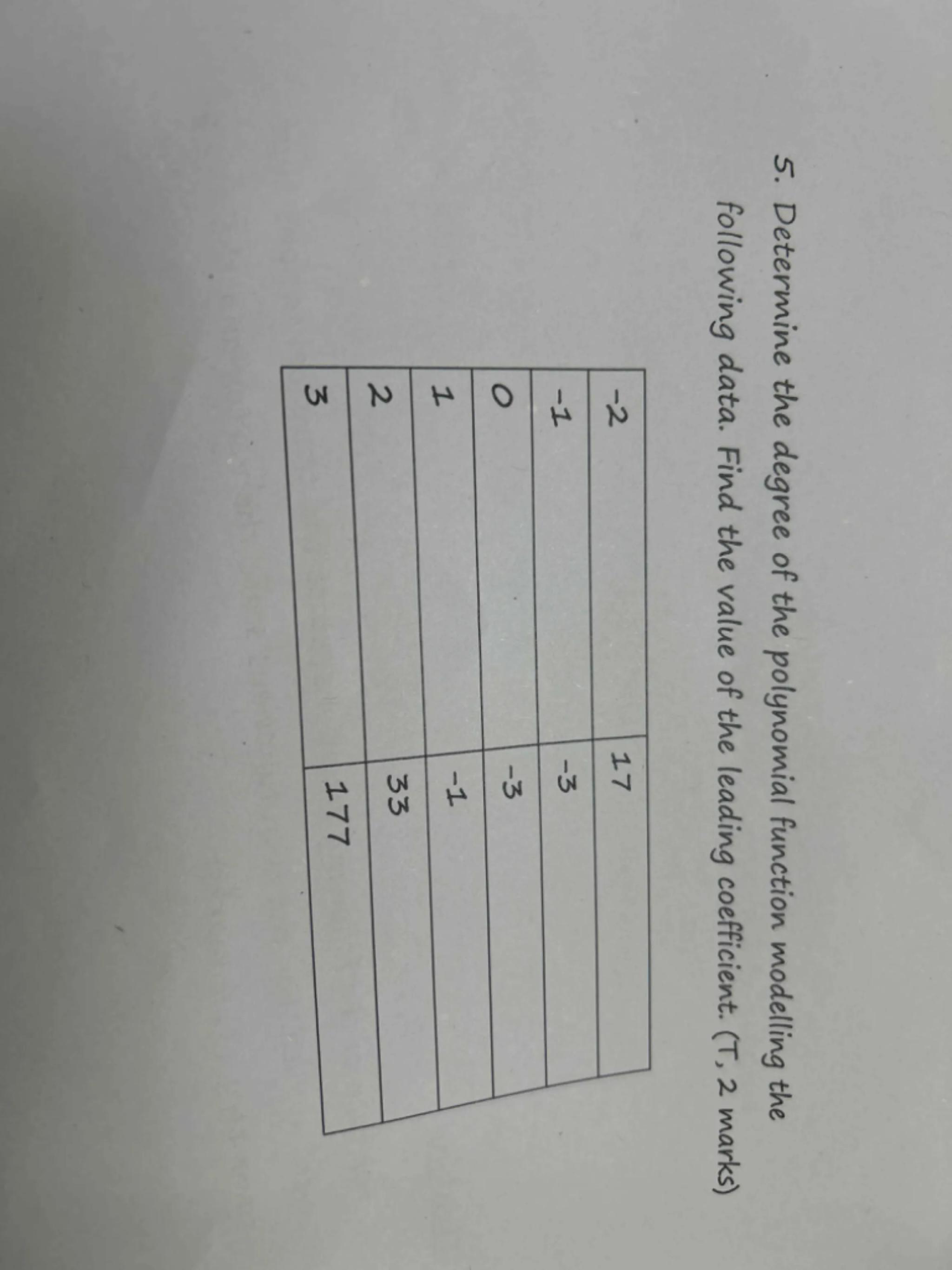 5. Determine the degree of the polynomial function modelling the following data. Find the value of the leading coefficient. (  marks)