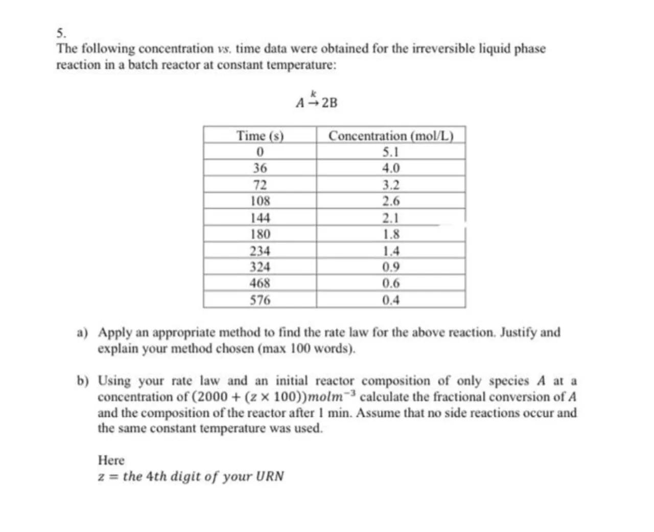 b) Using your rate law and an initial reactor composition of only species at a concentration of calculate the fractional conversion of and the composition of the reactor after . Assume that no side reactions occur and the same constant temperature was used.
