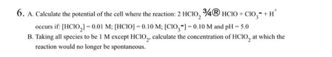 6. A. Calculate the potential of the cell where the reaction: 2 \mathrm{HClO}_{2} 3 / 4 ® \mathrm{HClO}^{3}+\mathrm{ClO}_{3}-+\mathrm{H}^{+} occurs if: and
