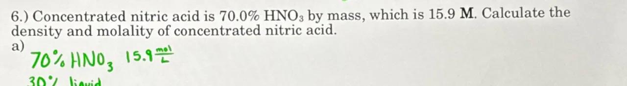 6.) Concentrated nitric acid is by mass, which is . Calculate the density and molality of concentrated nitric acid.