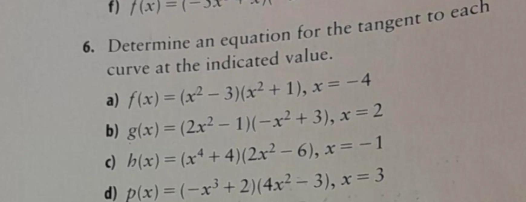 6. Determine an equation for the tangent to each curve at the indicated value.