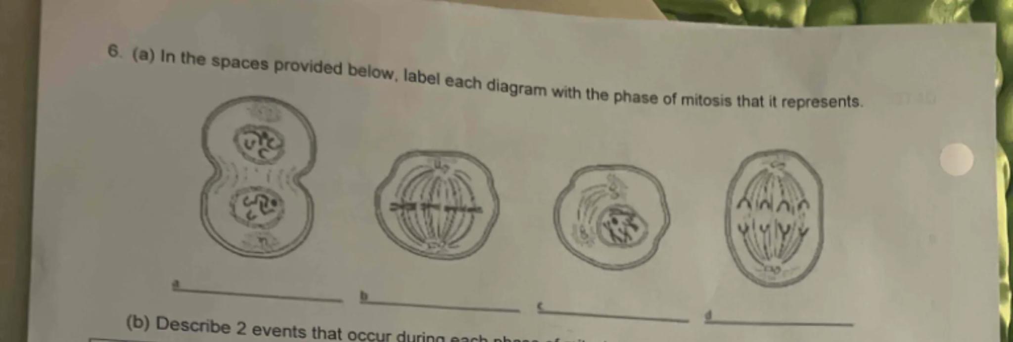 6. (a) In the spaces provided below, label each diagram with the phase of mitosis that it represents.