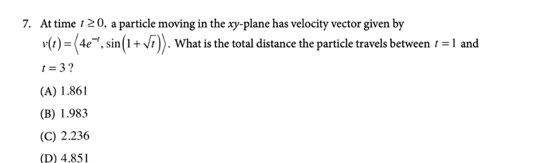 7. At time , a particle moving in the -plane has velocity vector given by . What is the total distance the particle travels between and ?