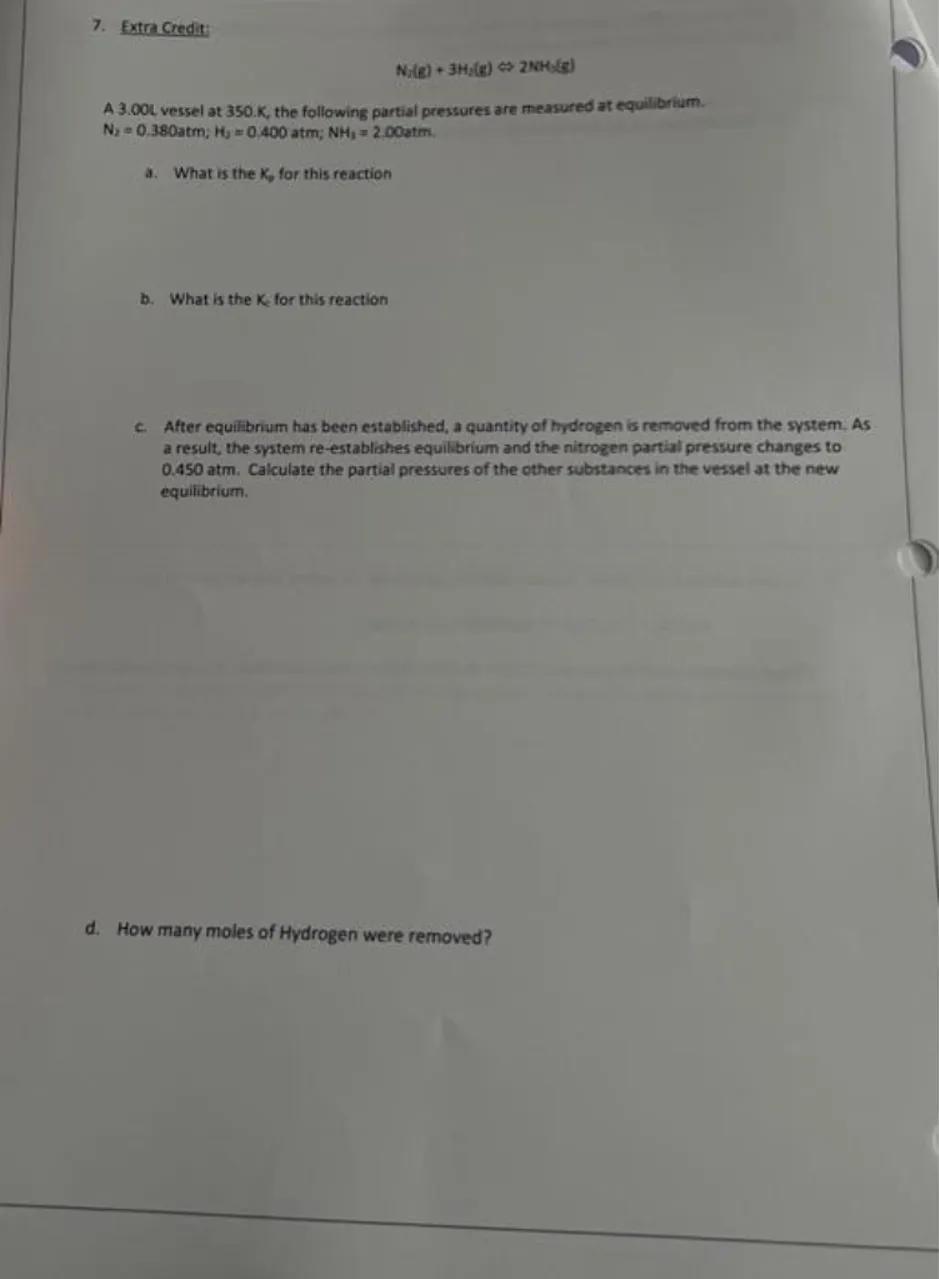 c. After equifibrium has been established, a quantity of hydrogen is removed from the system, As a result, the system re-establishes equilibrium and the nitrogen partial pressure changes to . Calculate the partial pressures of the other substances in the vessel at the new equilibrium.
