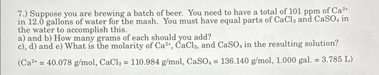 7.) Suppose you are brewing a batch of beer. You need to have a total of of in 12.0 gallons of water for the mash. You must have equal parts of and in the water to accomplish this,