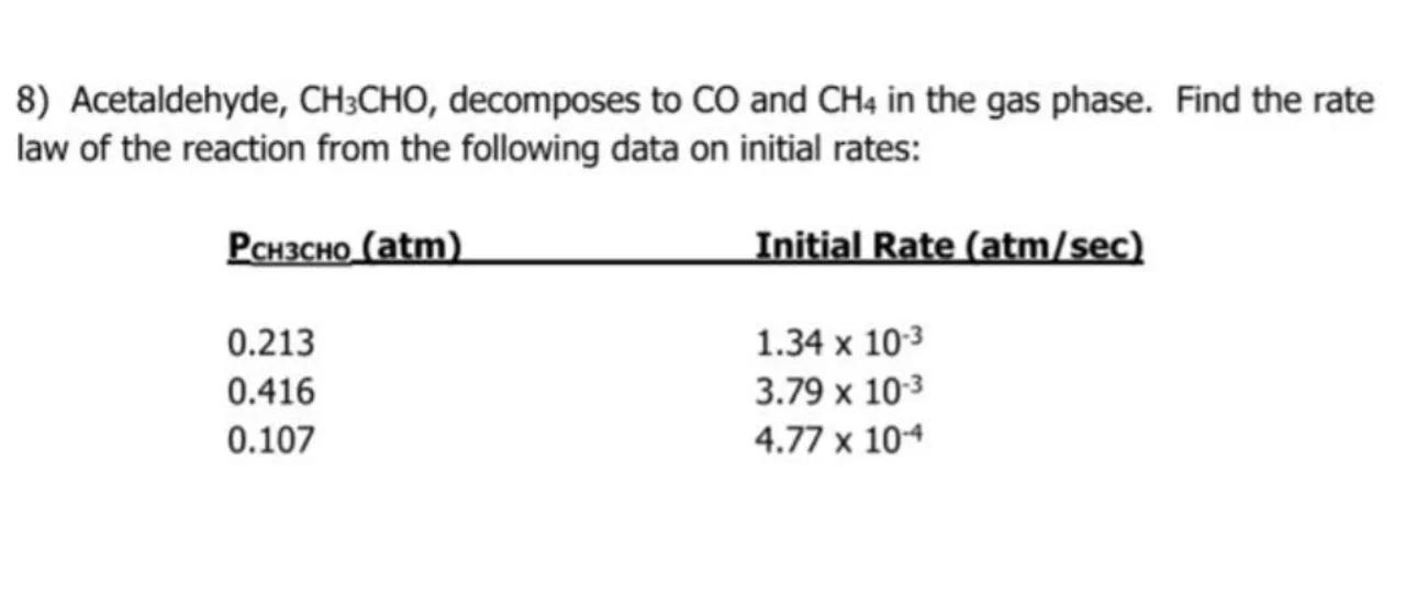 8) Acetaldehyde, , decomposes to and in the gas phase. Find the rate law of the reaction from the following data on initial rates: