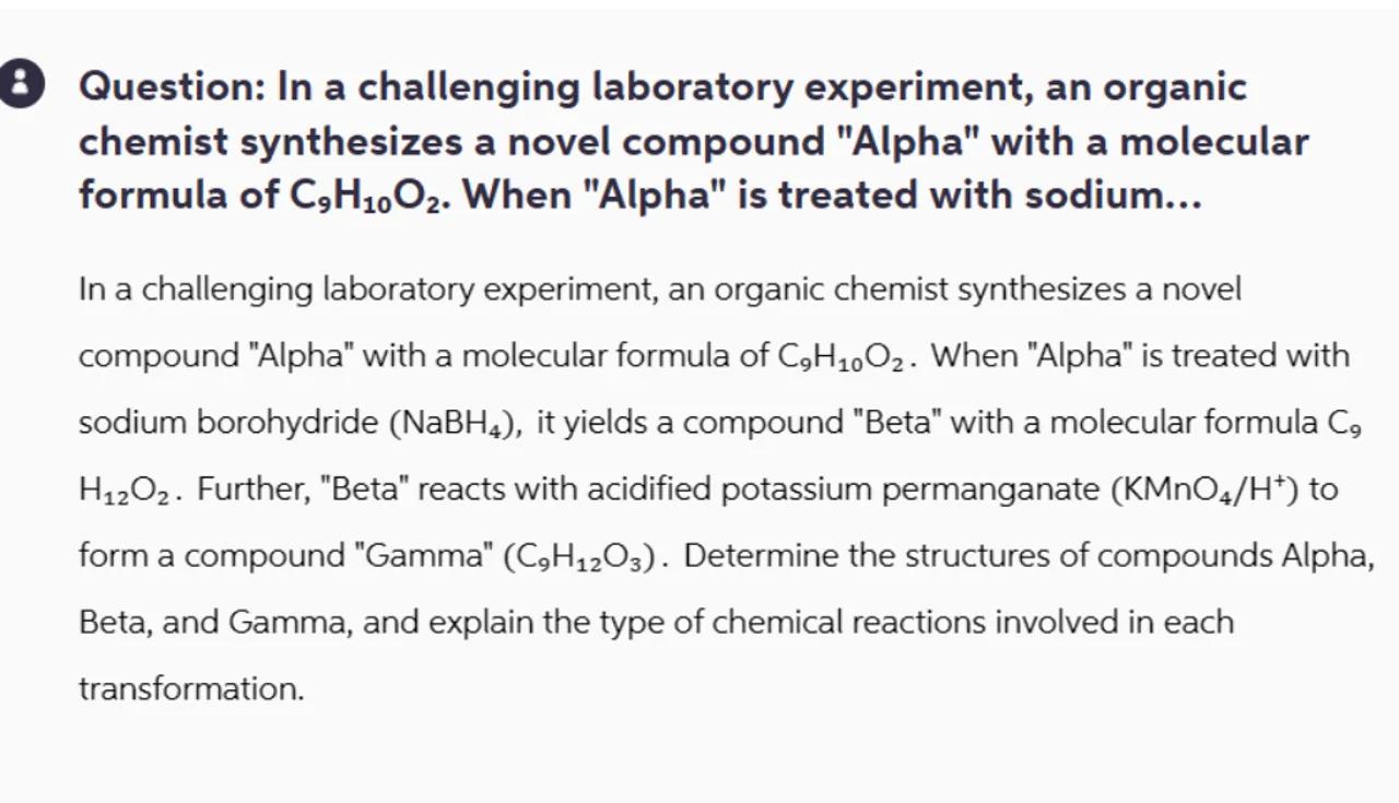 8 Question: In a challenging laboratory experiment, an organic chemist synthesizes a novel compound "Alpha" with a molecular formula of . When "Alpha" is treated with sodium...