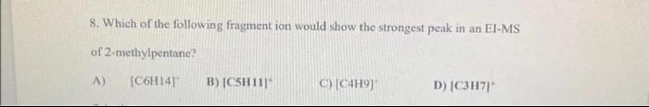 8. Which of the following fragment ion would show the strongest peak in an EI-MS of 2 -methylpentane?