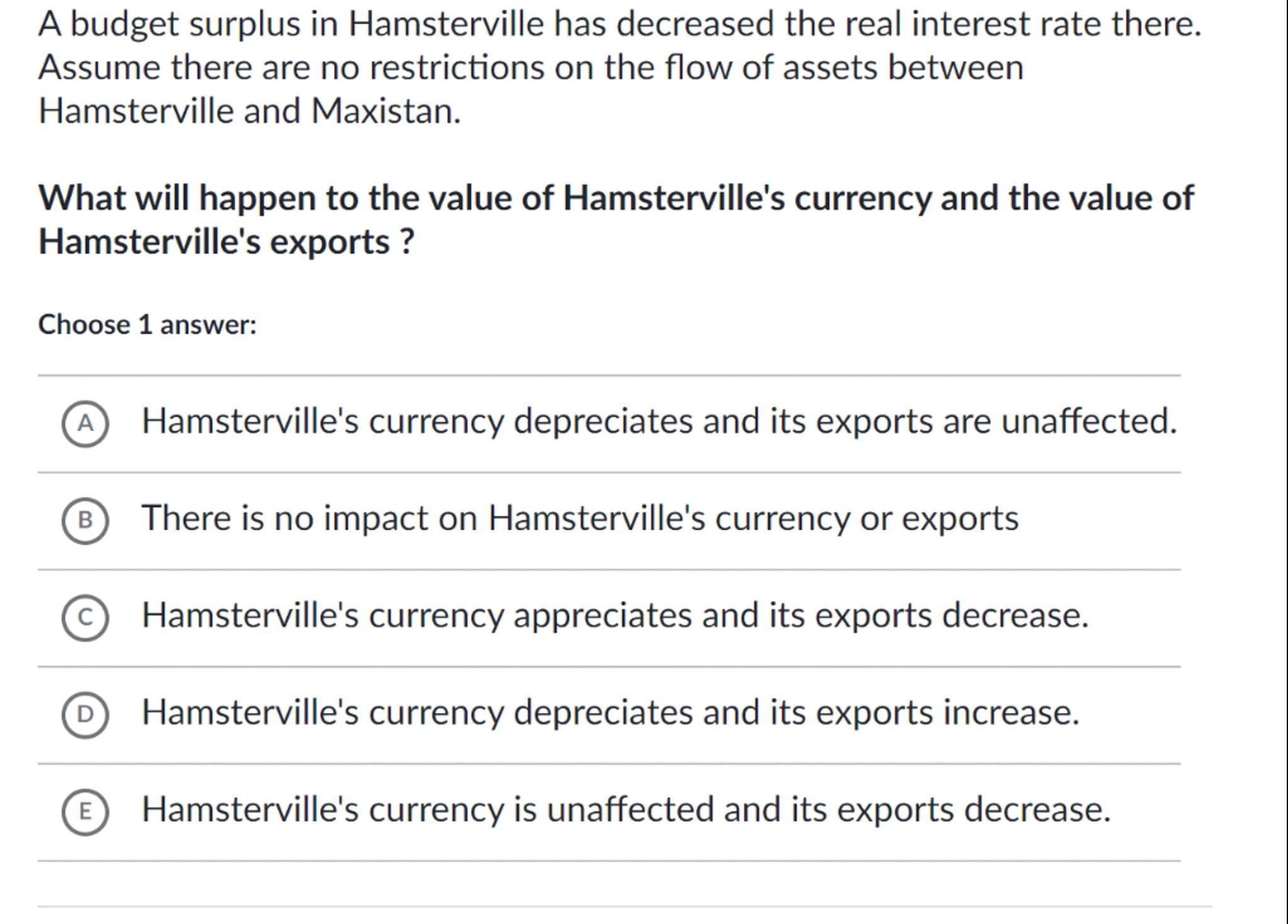 (A) Hamsterville's currency depreciates and its exports are unaffected.